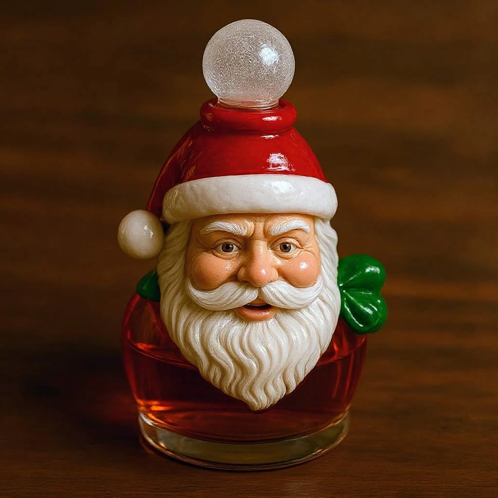 The design features Santa Claus, a frosted crystal ball nestled atop his red velvet hat, and a three-dimensional face sculpture. The clear glass bottle holds the red wine, resembling a small lantern under warm light on Christmas Eve. Add a festive touch to your decanting experience.
