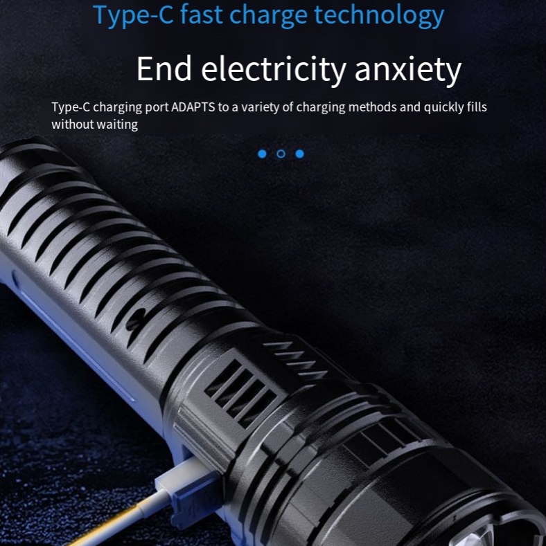 Advanced LED lamp beads and optical lens system are used to effectively gather light, achieve clear irradiation at a very long distance, The product uses 3 18650 lithium batteries, equipped with type-c fast charge function and external discharge function,and provide stable and strong lighting in bad weather conditions (such as rain, fog, wind, etc.) to ensure your safety in outdoor activities.