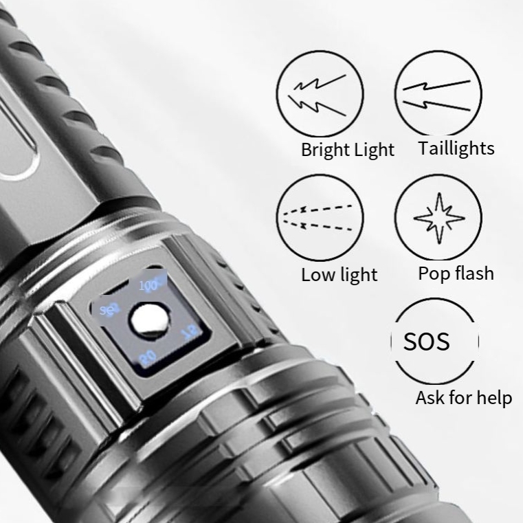 Our flashlight has 5 lighting modes, including high, medium, low, strobe, and SOS. You can easily switch between these modes to suit your needs. The high mode is perfect for brightening up a large area, while the low mode is ideal for conserving battery life. The strobe mode is great for creating a flashing light effect, and the SOS mode is perfect for emergencies.