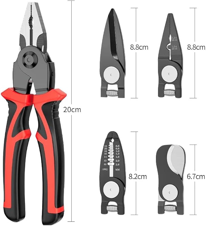 The versatile pliers kit comes with 5 different heads, including 1x pliers head, 1x scissors head, 1x cable cutting head, 1x stripping head, and 1x crimping head.