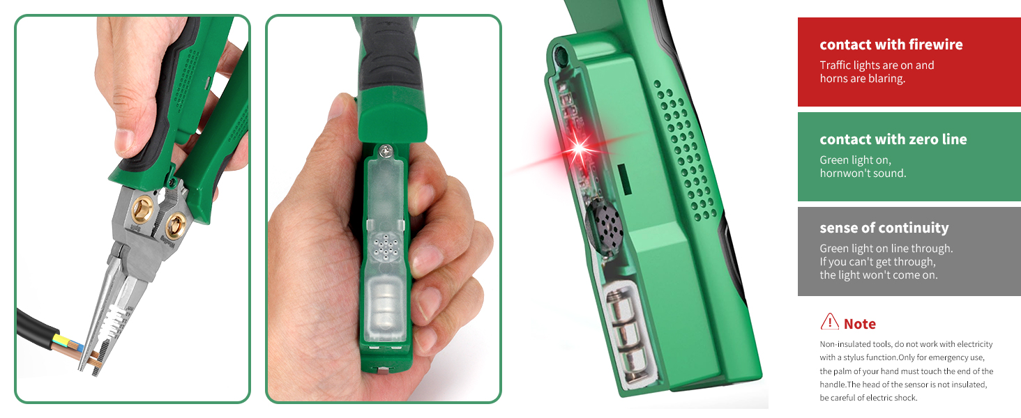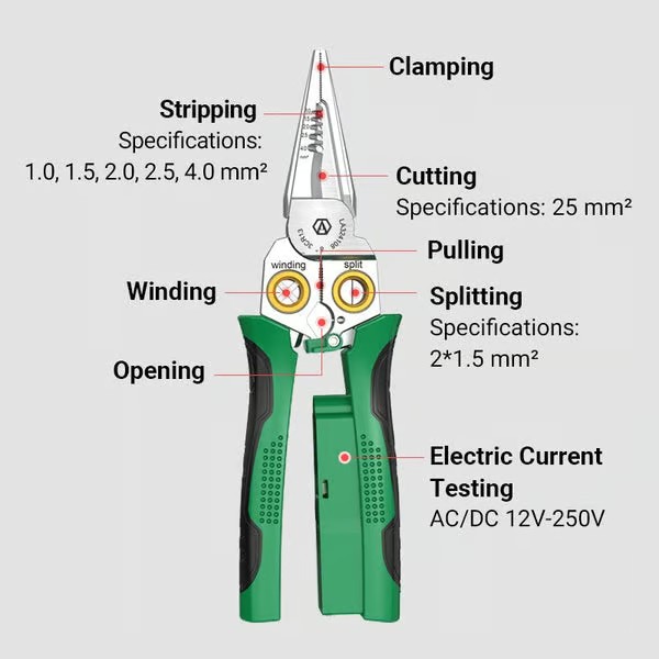 8-in-1 Wire Stripping Pliers With Voltage Test Feature, Offering Convenience And Accuracy For Electrical Work. Say Goodbye To Multiple Tools With This All-in-one Solution.suitable For AWG 18,14,12,10,6/1.0,1.5,2.0,2.5,4.0mm²; Cape Cable 25mm² Wire, Open Cable Outer Skin, Divide Wiring 2*1.5mm²