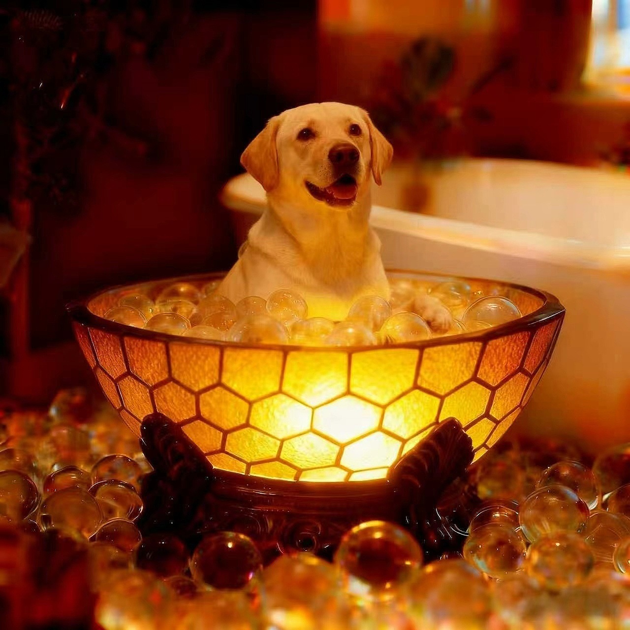 💜 Charming Pet Design: Crafted from durable resin, this lamp features a hyper-realistic dog (choose from Labrador, Husky, Corgi, Poodle, etc.) “soaking” in a mosaic-style “bathtub” filled with tiny clear bubbles. Topped with sparkling crystal gravel accents, it’s a playful focal point for any desk, nightstand, or shelf.