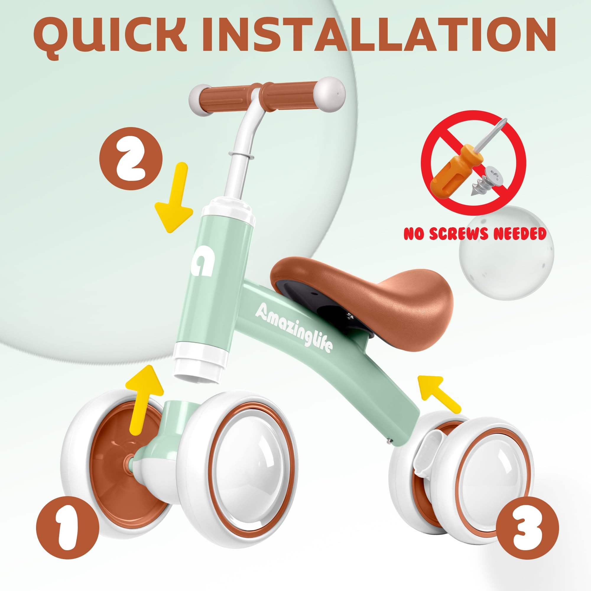 Easy To Assemble: The magic of our baby balance bikes also lies in the assembly. The toddler bike uses a spring buckle design. No tools are needed, just insert each spring into the corresponding slot, and when you hear a click, it's installed correctly! The installation process is simple and fast.