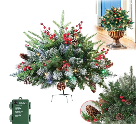 Each tree is pre-strung with 60 warm white LED lights and adorned with pine needle branches, 8 bunches of red berries, 8 bunches of golden berries, and 10 pine cones, adding a lively touch to your holiday decor. The tree operates on 3 AA batteries (not included).