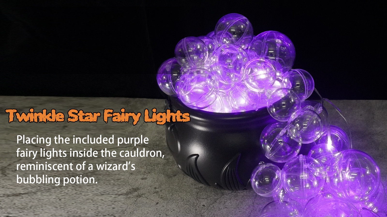 The witch bubbling cauldron set is made of high-quality plastic. The ball is transparent, the light string is purple, and the white cotton can represent the fog, which can flexibly create different decoration styles.