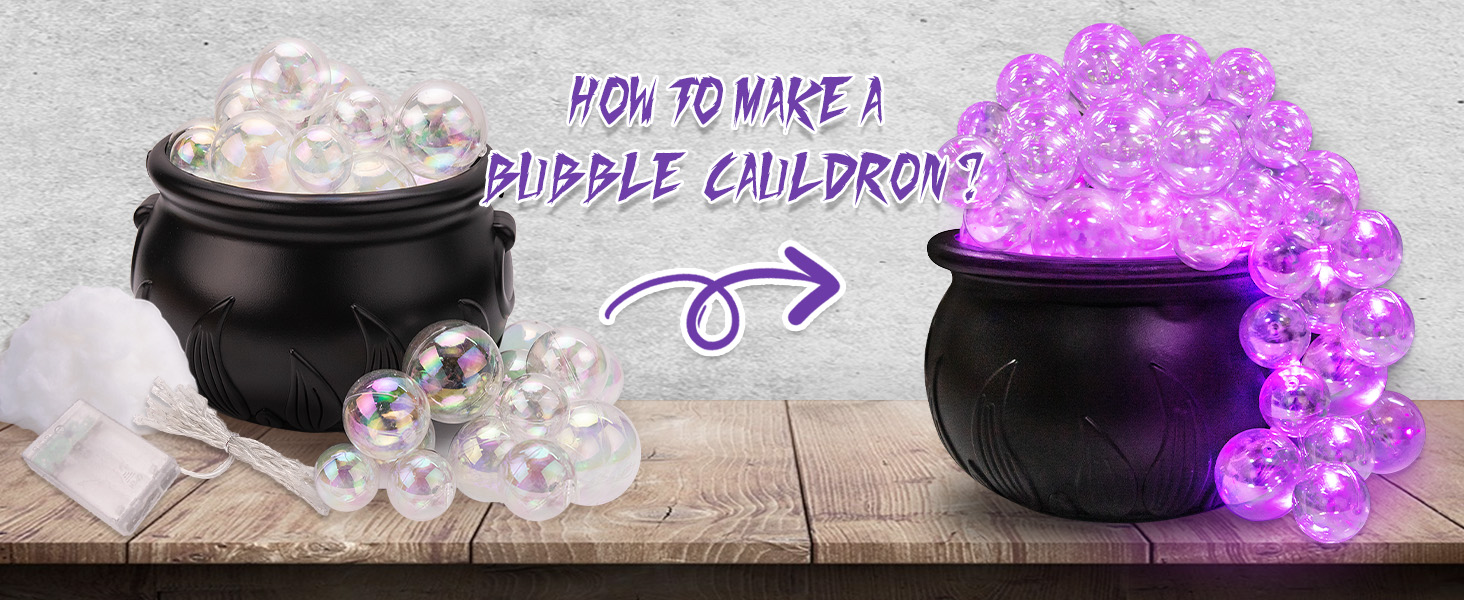Cute and atmospheric: Put the fluffy cotton into the bottom of the pot, put the transparent bubble balls randomly on top of the cauldron, fix them with adhesive dots, and decorate them with LED lights; you will get a very cute witch cauldron with many accessories inside, which is convenient to use