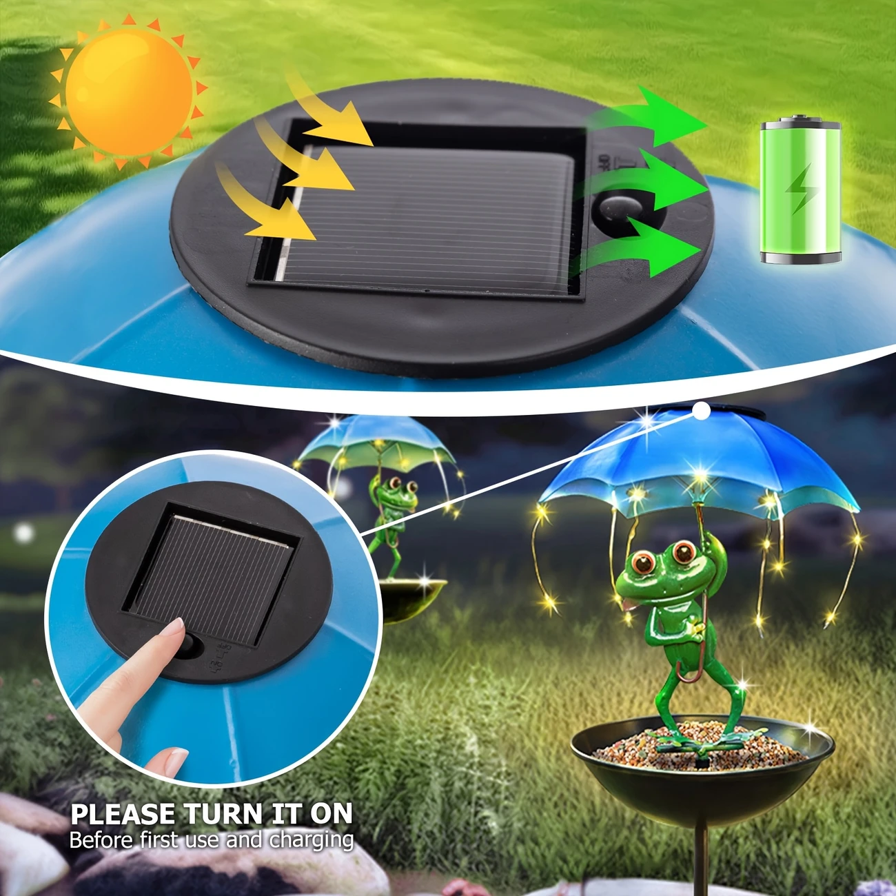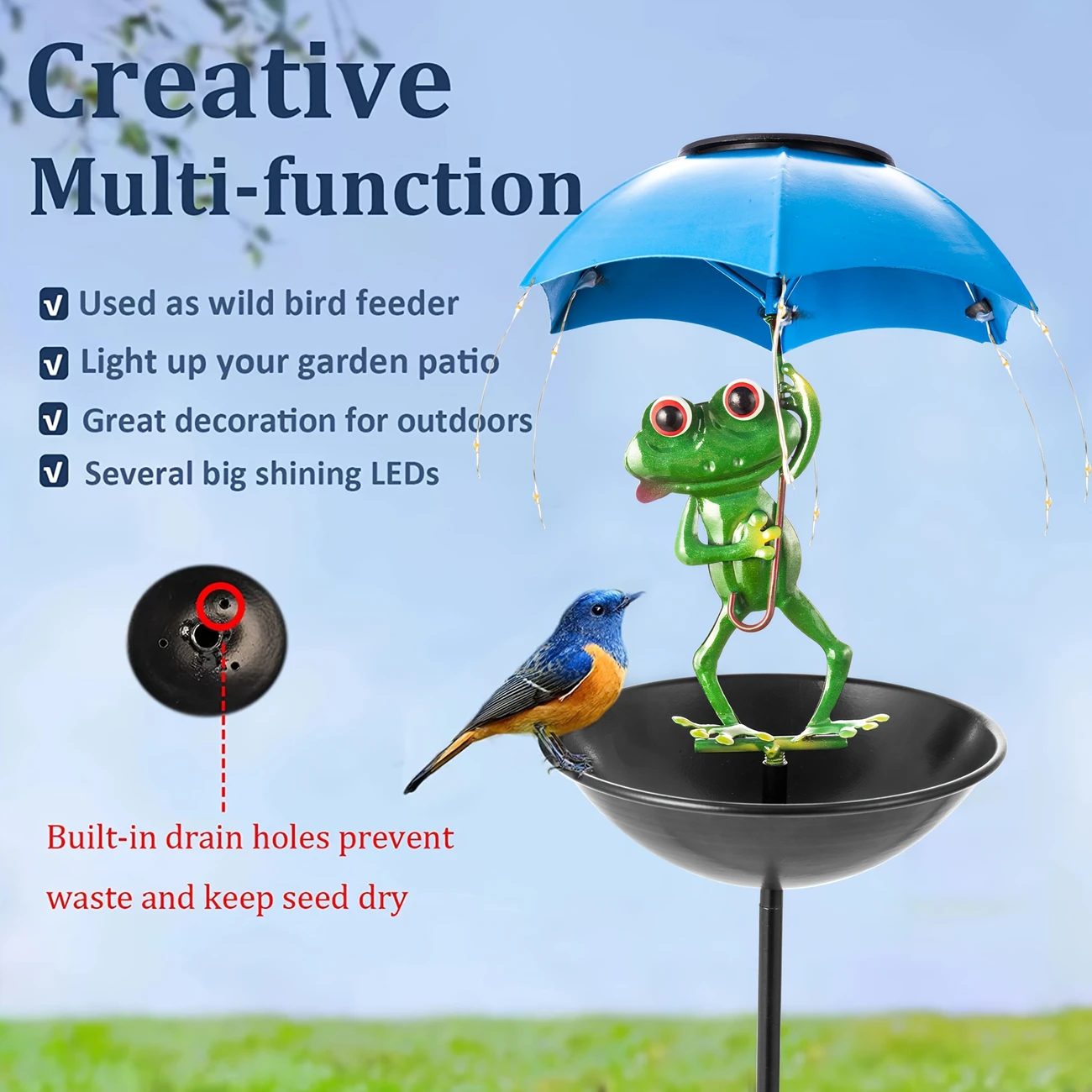 This frog statue solar powered and outdoor bird feeder is well made, each one is handmade. If your yard is too boring, this will be a lovely addition!