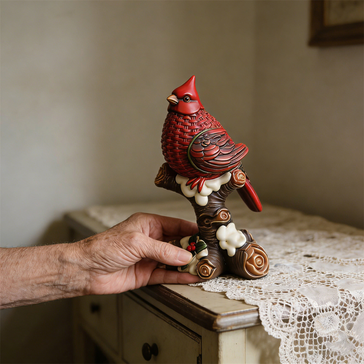 This lifelike cardinal, with its glossy red body featuring a woven-like texture, symbolizes the warmth and intertwining of love.