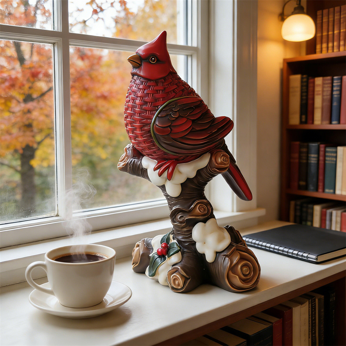 Vibrant Cardinal Sculpture: The bird’s body features a unique glossy finish with a textured, woven-like pattern. Its rich, red hue is deep and lustrous, offering a handcrafted feel and premium appeal.