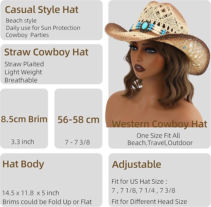 Its neutral design makes it suitable not just for women but also for men, perfect for sharing fashion among couples and friends.Cowgirl hat head circumference is 22.8 inches, suitable for most elegant ladies, the brim width is 3.5 inches and slightly upturned, providing you with vintage and wild west cowboy temperament.