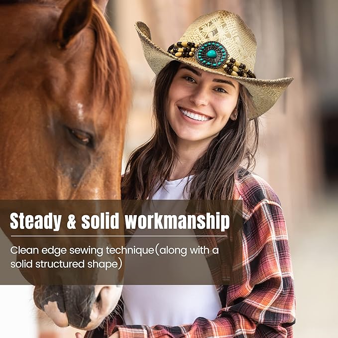 Each cowboy hat is handmade, exquisite craftsmanship shows a unique texture.The straw material makes this cowboy hat breathable even in spring, summer or warm seasons. The soft inner band absorbs sweat and is comfortable, and the brim effectively blocks harmful sunlight and protects your eyes and face.