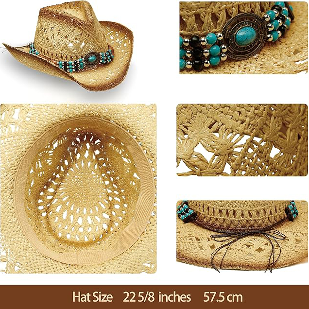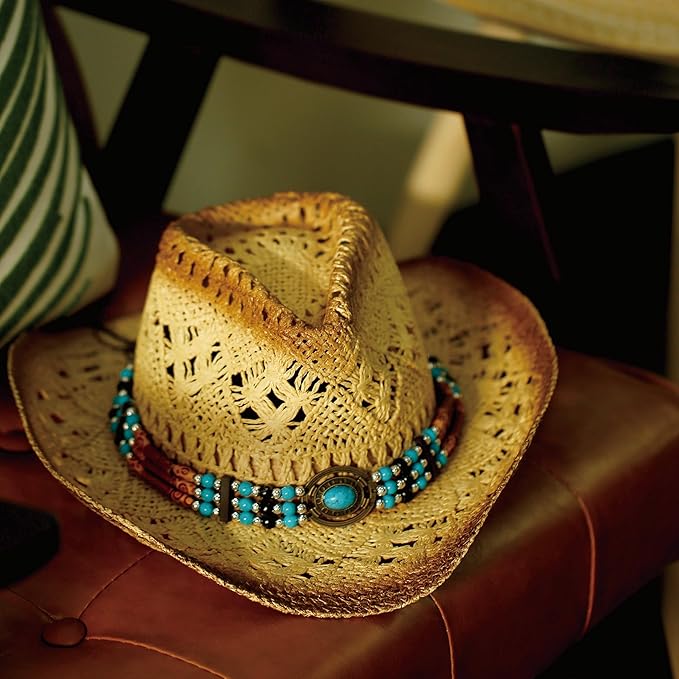 The hat features decorative bands made of wooden beads or woven leather and Natural turquoise gemstone, adding a unique western cowboy flair and carrying an elegant vintage appeal.