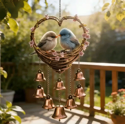 Perfectly designed for lovers of birds, garden décor, and serene ambiance, this charming wind chime features two beautifully detailed birds nestled in a heart-shaped nest adorned with delicate pink blossoms—symbolizing affection, peace, and the joy of companionship.