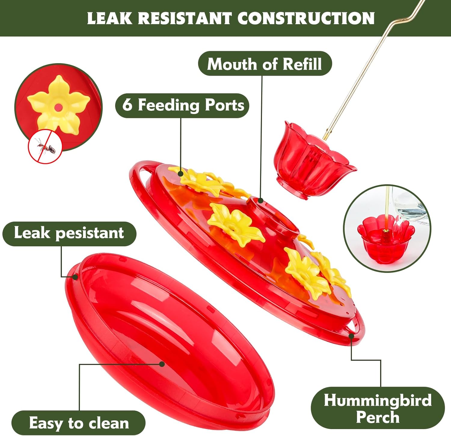 This bright red Plastic saucer hummingbird feeders with round and flat dish design, 6 flower-shaped feeding ports and perches are arranged in a circular manner for several birds to feed at once, Each has 7 ounce nectar capacity, easy for hummingbirds to drink water without wasting.