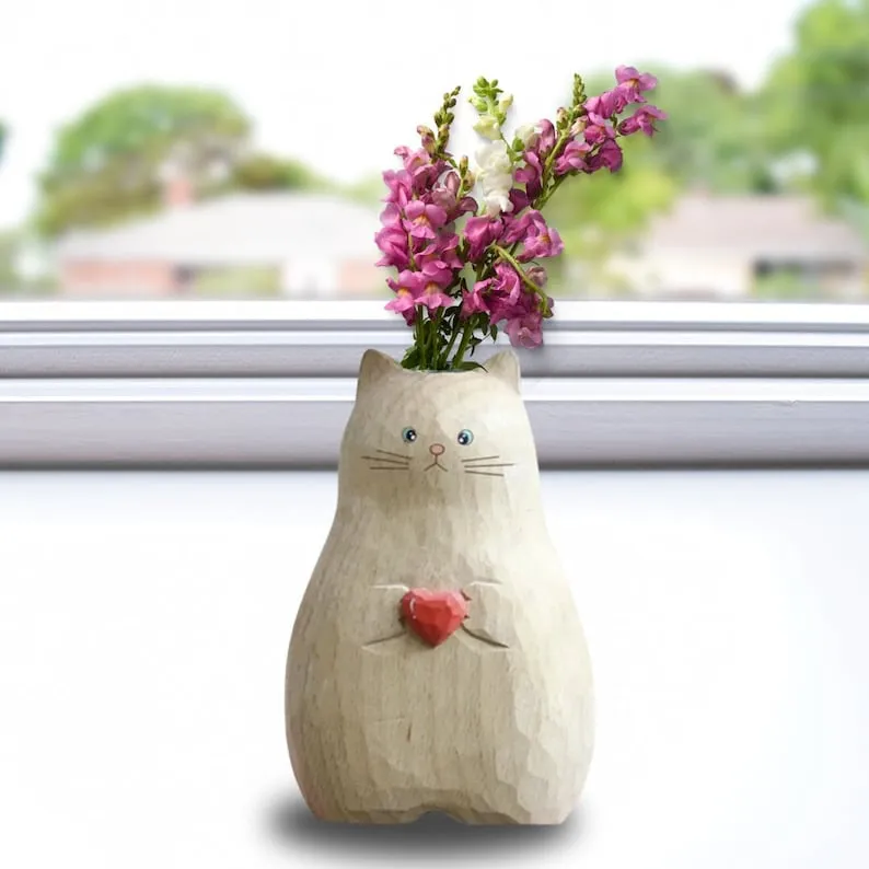 This handmade cat vase is carefully carved from recycledmaterials and hand painted love heart with vibrant coloursthat attempt to match nature's beauty.