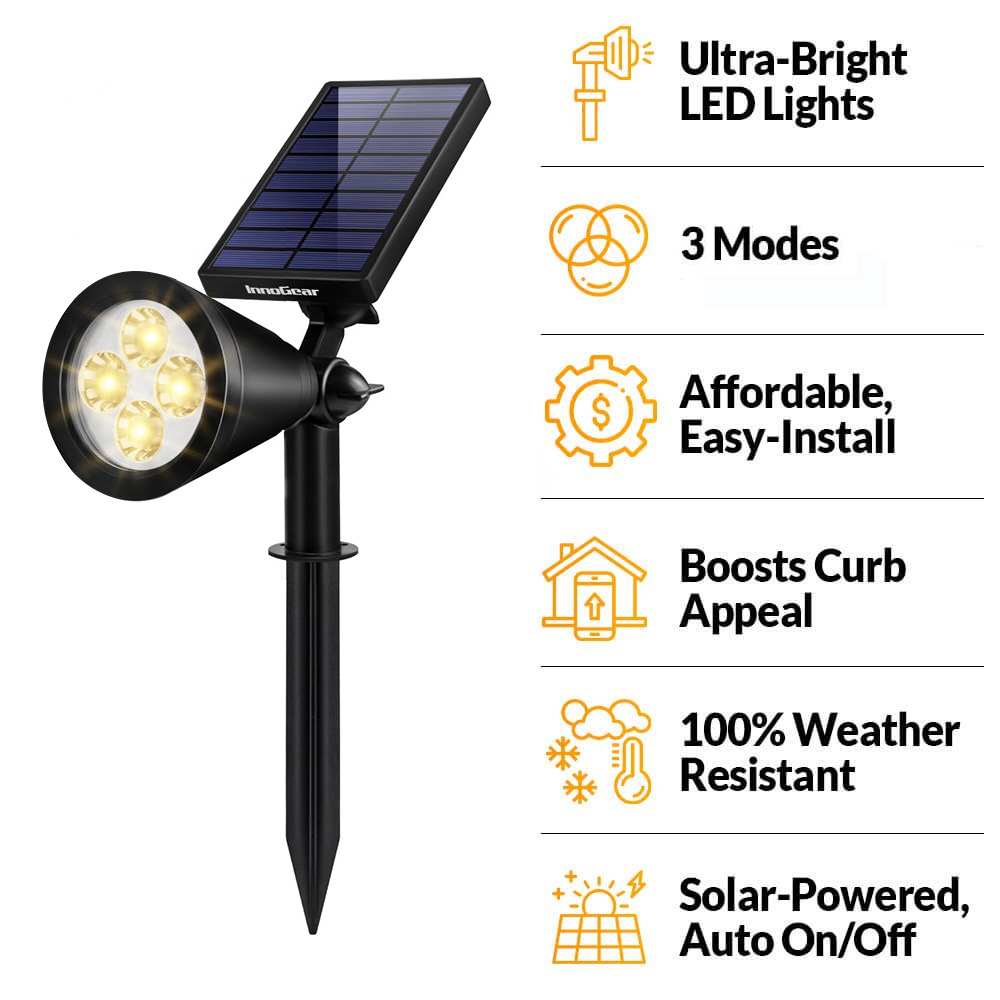 Independently Adjustable Light & Panel: Other solar lights in the market with combined light panel heads are very difficult to capture sunlight and illuminate in the same location in all seasons. Our InnoGear outdoor solar lights feature independently adjustable light and panel; you can adjust the solar panel up and down at 90° to capture sunlight efficiently and aim the light at a different angle at 90° to precisely illuminate any place that would be out of reach.