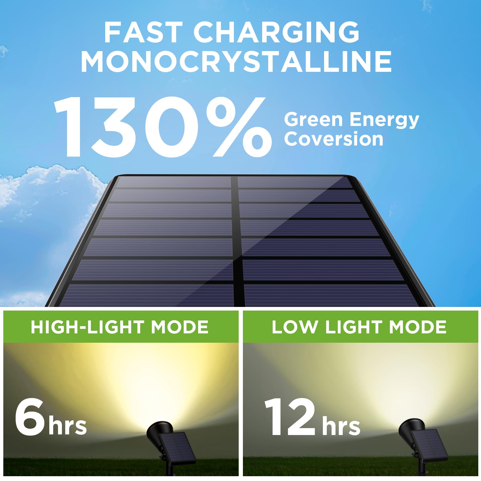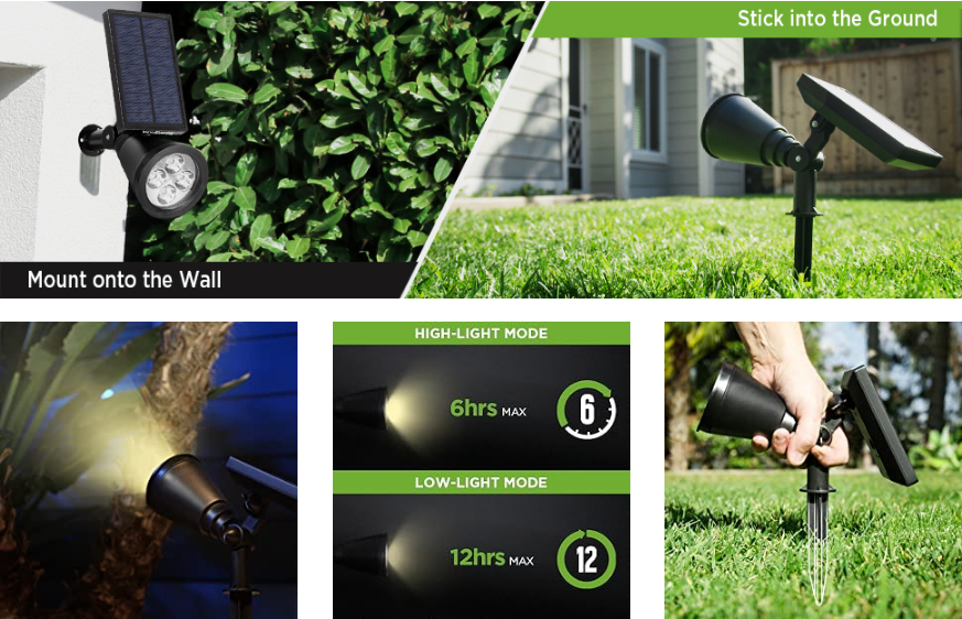 Improved Brightness & 2 Working Modes: With super brightness, this solar spotlight can cast a focused ray to highlight your flagpole or beautiful sculpture, even on the darkest of nights. You have the option to set from High Mode (MAX 6Hrs) to Low Mode (MAX 12Hrs) to extend working time.