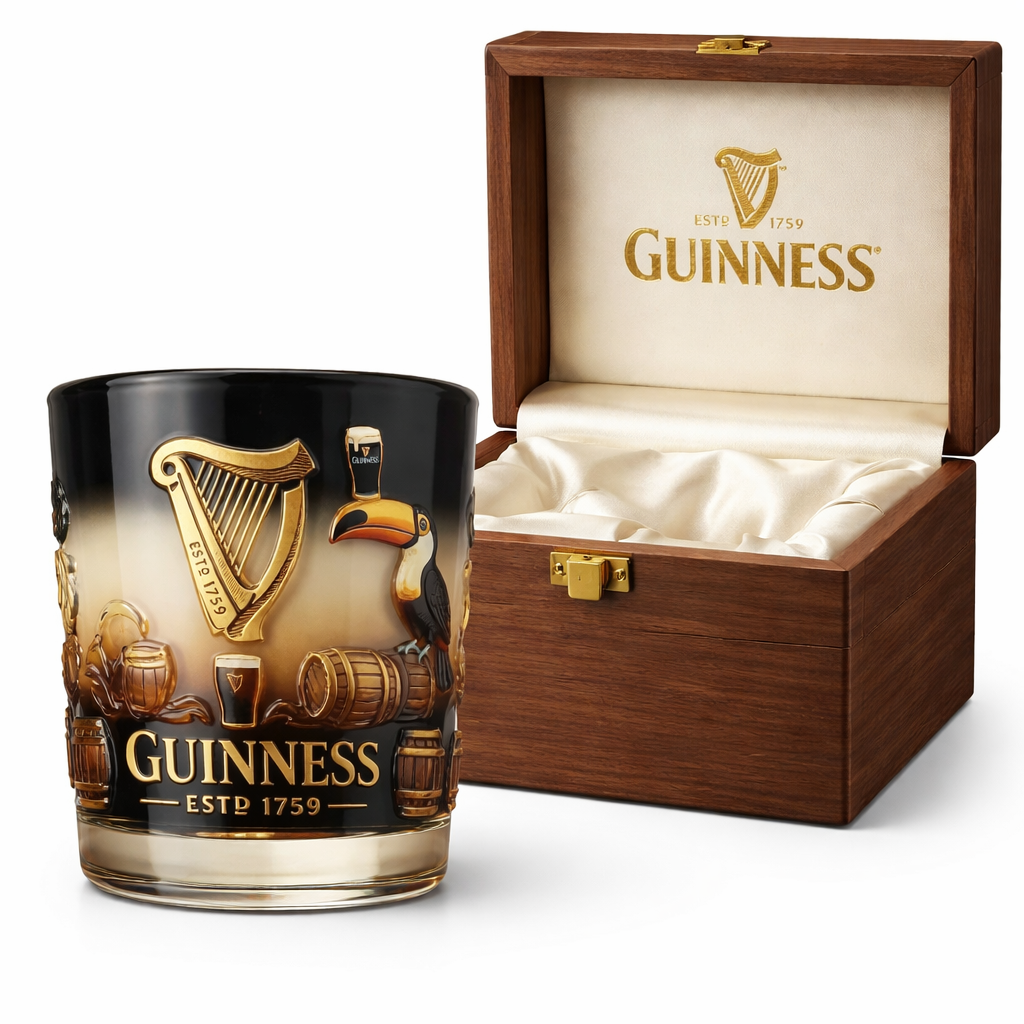 🔥 Sculpted. Not Just Printed. Run your fingers across the glass, and you’ll feel the difference. 🖐️💎 This is true high-relief craftsmanship. From the golden strings of the Harp to the oak barrels and the iconic Toucan balancing his pint, every detail is raised, textured, and hand-painted. It turns every sip into a tactile experience.