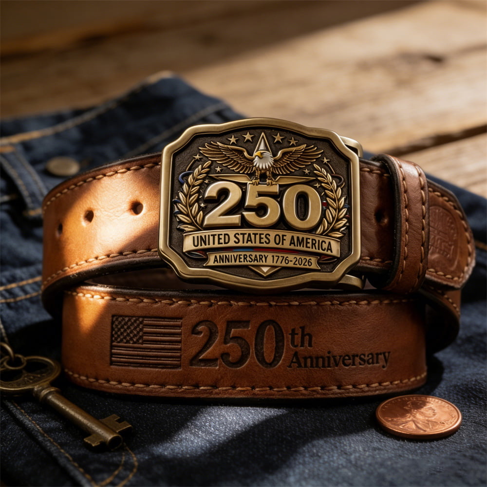 Mark two and a half centuries of American independence with this USA 250th Anniversary commemorative leather belt. Crafted from premium distressed brown full-grain cowhide, it boasts a rugged, retro character that only gets better with age. The substantial retro brass buckle is cast with intricate details—a bold "250" at its center, flanked by a soaring bald eagle, olive branches, and star bursts. Below, the inscriptions "UNITED STATES OF AMERICA" and "ANNIVERSARY 1776-2026" ground the design in history. Along the strap, finely engraved American flags and "250 Anniversary" motifs repeat the patriotic theme. Whether paired with jeans, workwear, or Americana-inspired outfits, this belt is a wearable tribute to 250 years of freedom.