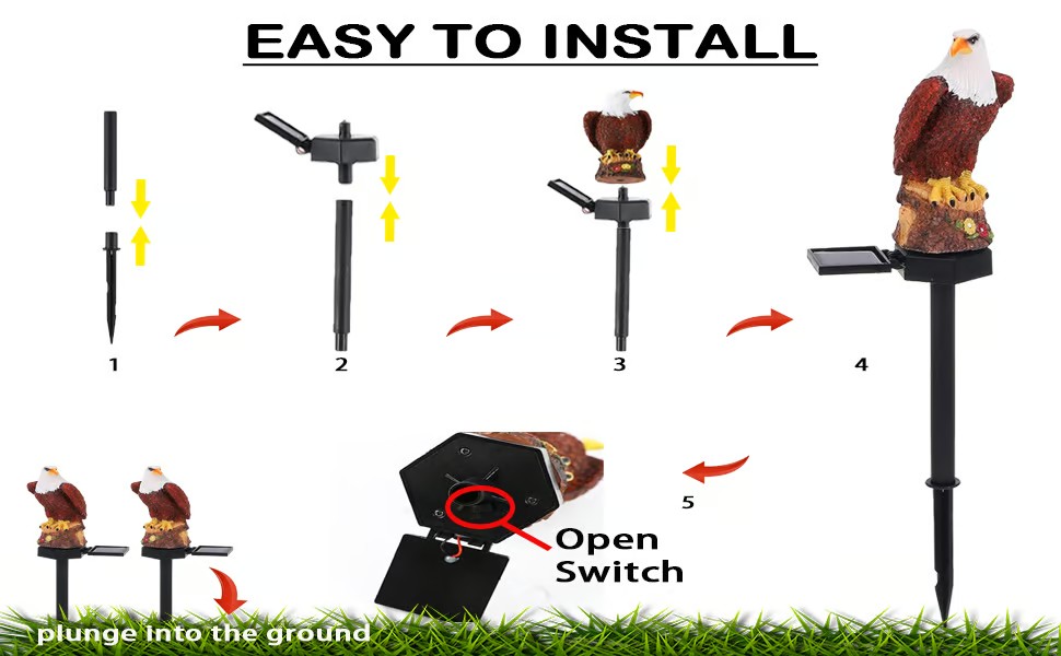 🦅The solar panel charges during the day, and the lights automatically turn on at dusk . No wiring is required to place them in a sunny spot .Detail eagle handicraft sculpture,in the daytime it as a garden statue decoration and in night time it will light up from inside body.